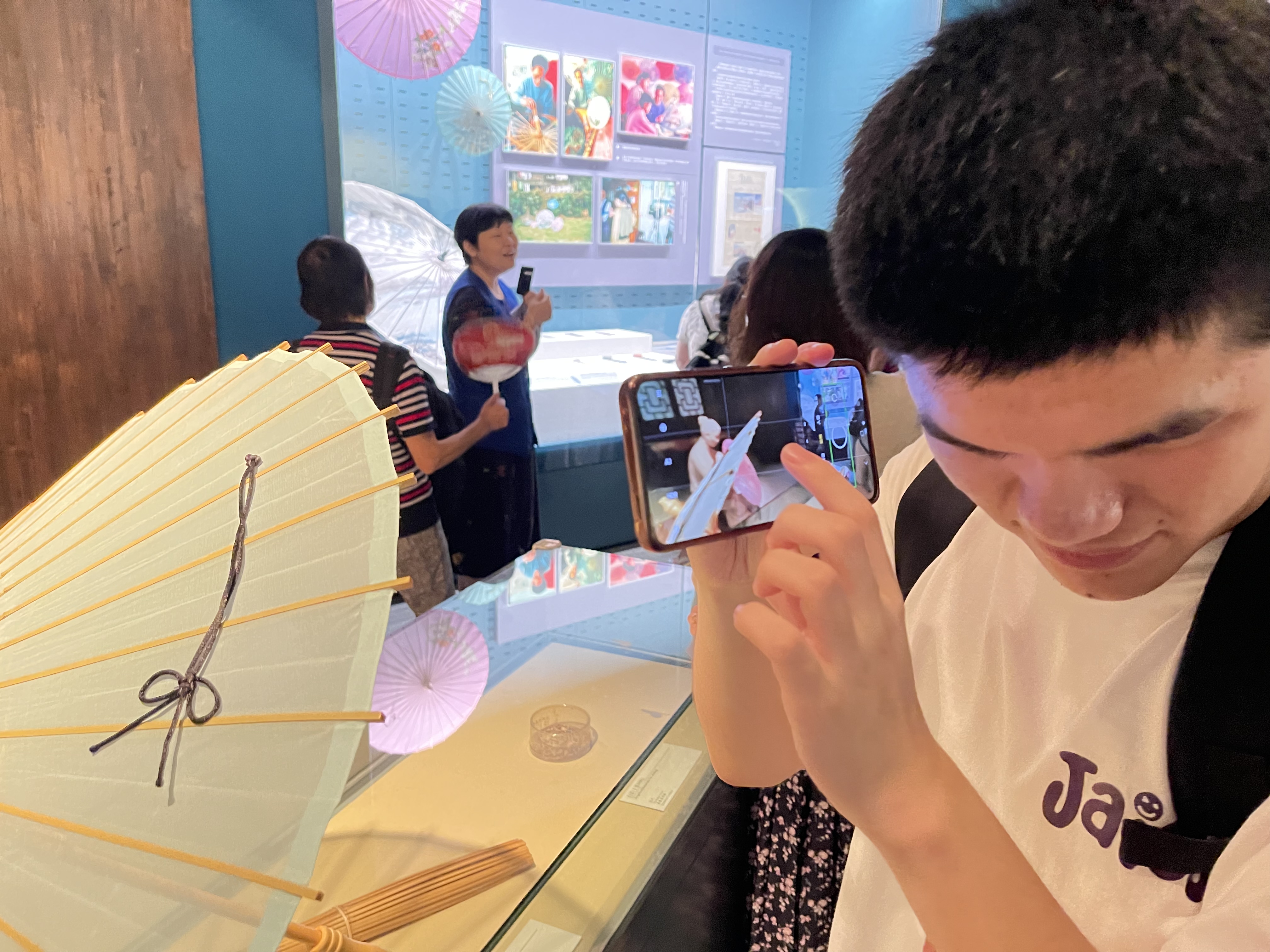 在“西湖绸伞”板块,用场景模拟的方式打造了西湖景观场景,墙面上描绘着西湖,盛开的荷花、碧绿的莲叶点缀在湖面上,十多把绸伞错落有致地分布在墙面上。讲解员向视障读者们介绍,杭州盛产丝绸,都锦生先生在上世纪30年代初,利用杭州本地的淡竹和丝绸创制出绸伞,由于伞面装饰多采用西湖风景,因此被称为“西湖绸伞”。西湖绸伞伞面装饰精美,元素多样,有的绘制有西湖地图,还有的则呈现了长江三峡之巫峡的大气磅礴。在志愿者们的帮助下,视障读者纷纷触摸、开合绸伞复制品,拿出手机拍摄精美绝伦的西湖绸伞。