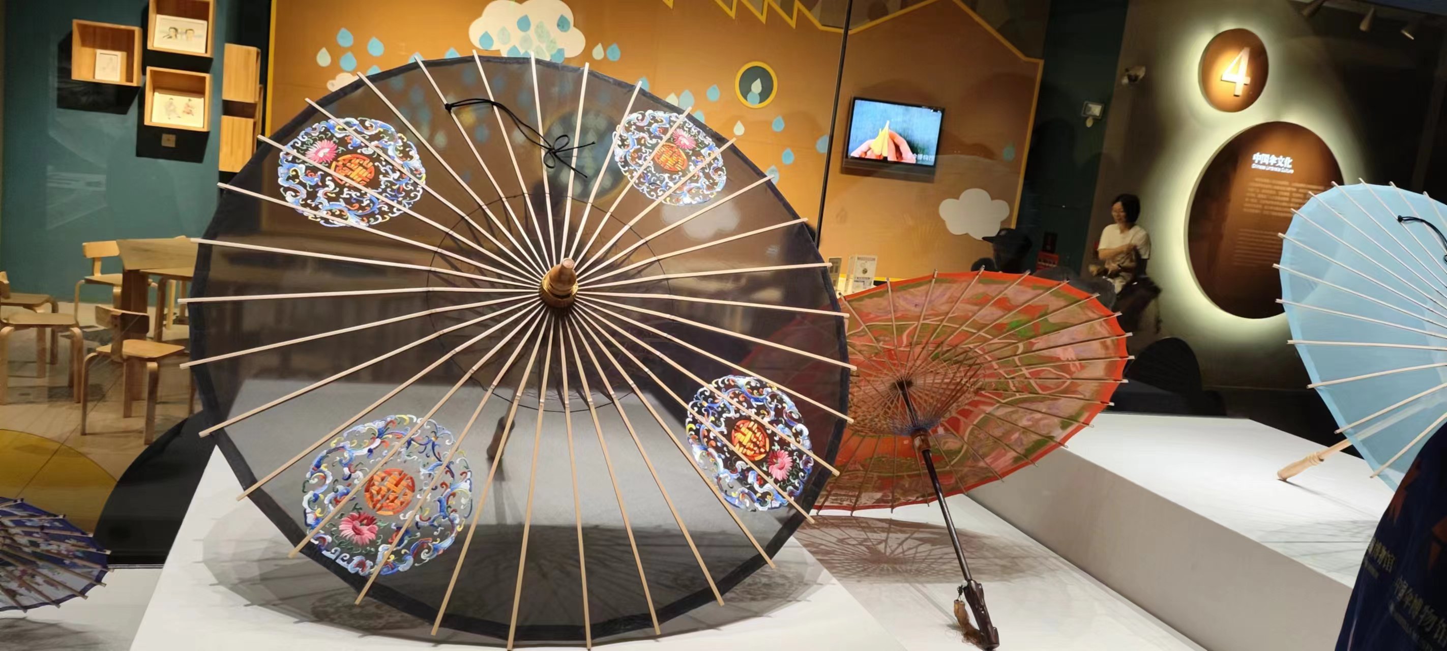 为了提升视障读者的参观和摄影体验,本次活动还特别安排了无障碍导览讲解和现场触摸体验。在讲解员的带领下,大家首先经过伞博物馆的序厅,地面上是投影模拟出的雨滴滴落的景象,天花板上悬挂着红色的伞状艺术灯,两边墙面屏幕展现出四季轮换的江南景色,观众仿佛漫步在江南烟雨中。