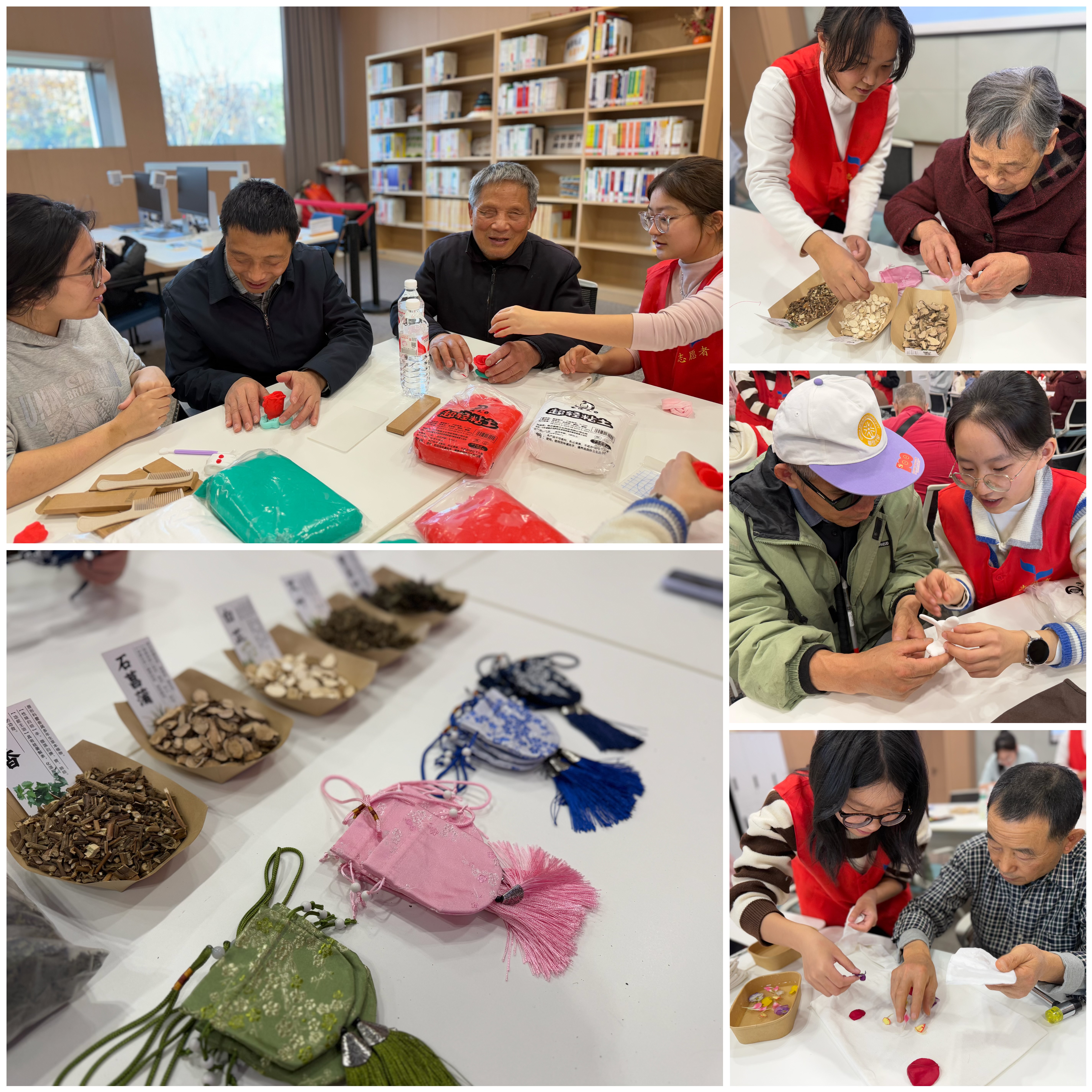 活动现场设置了四个特色体验区,由计量大学团委手工社团的志愿者一对一引导视障读者深度参与。在果壳风铃制作区,读者通过触摸果壳的纹理与形状,亲手组装出一个个灵动可爱的风铃挂饰;植物拓染体验区中,在志愿者的细致讲解下,视障读者将不同植物的叶片与花瓣精心排列,通过轻轻敲击,将大自然的色彩与形态拓印在帆布袋上;中草药香包制作区里,读者通过触摸辨识药材形态、嗅闻辨别香气特性,亲手调配并制作出兼具实用与纪念意义的个性香囊;传统面塑体验区则让读者在揉捏塑形中感受非遗技艺的魅力,一朵朵精致的玫瑰花、一只只栩栩如生的大公鸡在指尖悄然绽放。