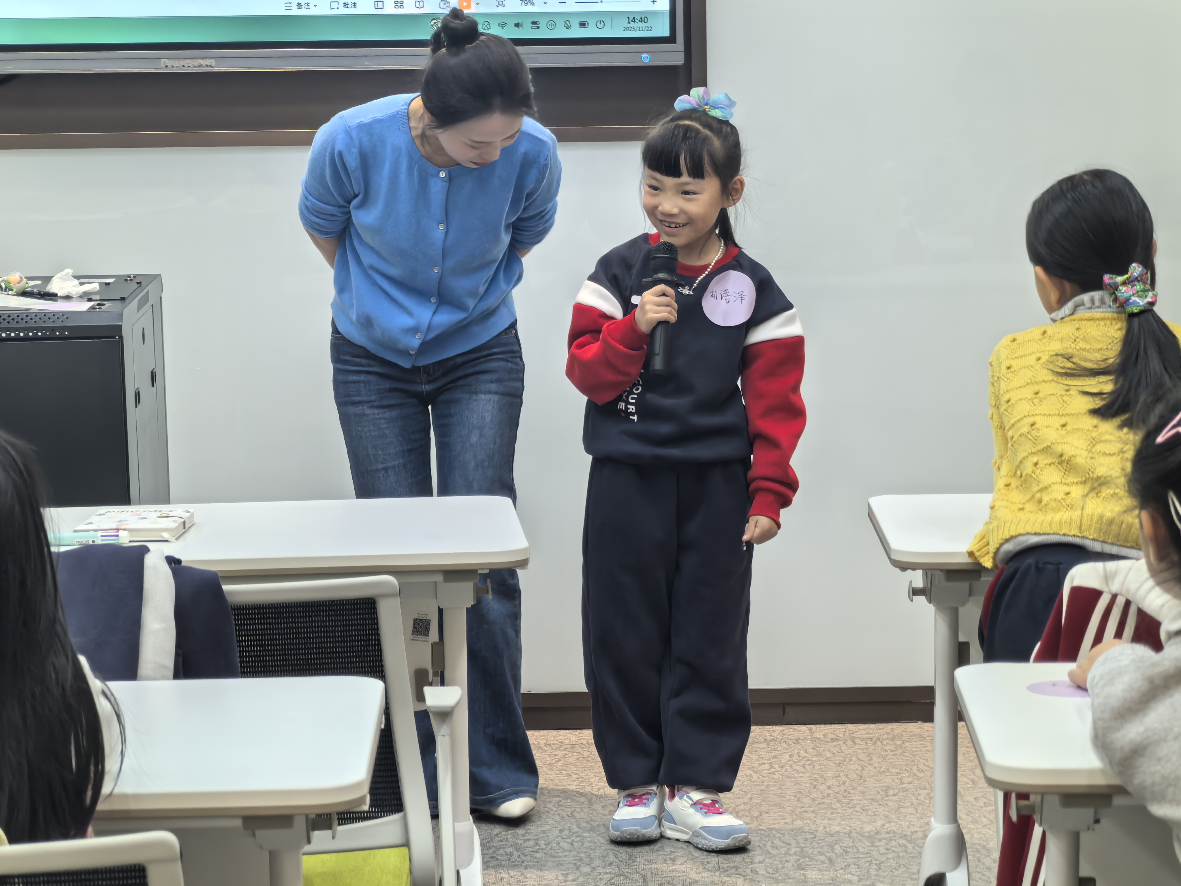 在简单的发音练习结束后,小雨老师带领小读者们逐句拆解绕口令《八百标兵》,并通过此实践的方法,进一步锻炼唇舌,使其变得更加有力,也能够让发音变得更加标准。小读者们纷纷站上讲台,拿起话筒,如同一位小主持人一般一字一句地表现着他们通过这场活动所学习到的成果。也许口语并不能在这短短的两个小时呈现出质的飞跃,但小读者们脸上的笑容和由内而外散发出的自信,也是这场活动带给他们的宝贵财富。